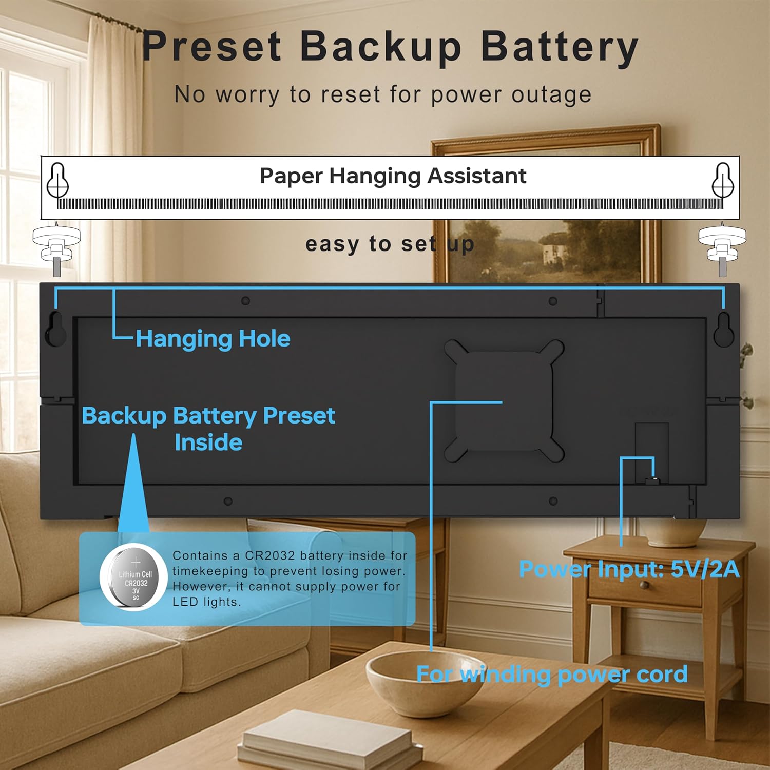 - ăPlug-In Power (Keeps Settings During Outages)ă Just plug it in! It uses the included long power cord (11.5 feet) and adapter (5V/2A). While it needs wall power to run, a built-in backup battery saves your time and settings if the electricity goes out.