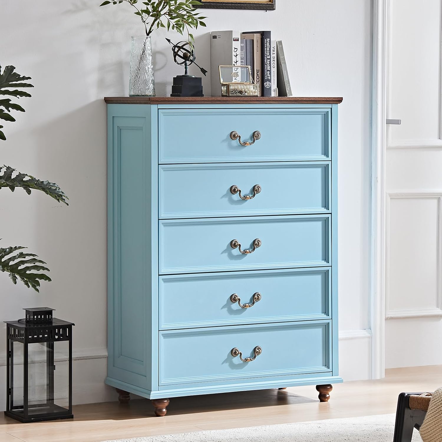 Farmhouse 5 Drawer Dresser Set of 2 for Bedroom, 45" Tall Vintage Chests of Drawers w/ 4 Solid Wood Feet, Mid Century Rustic Closet Storage Dressers Organizer for Living Room, Light Blue