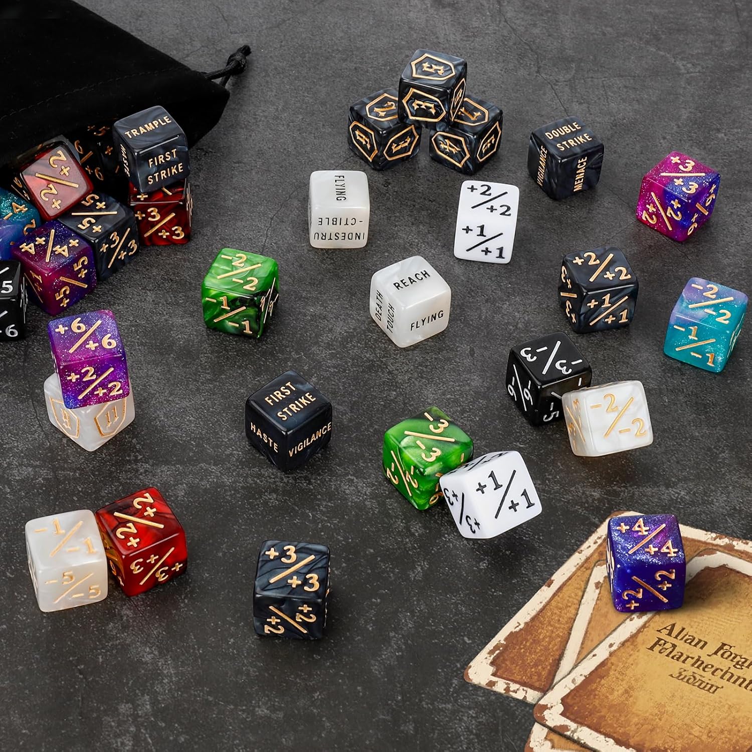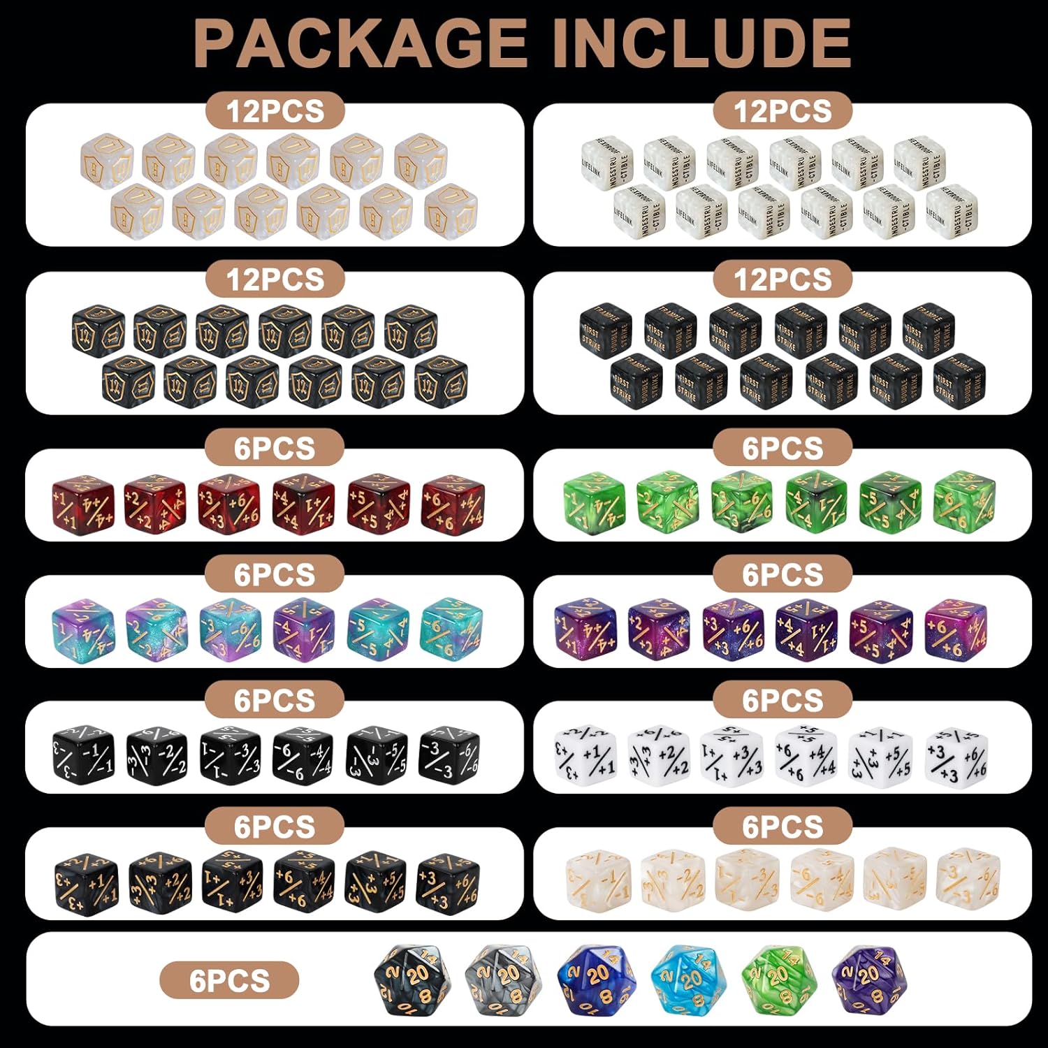 - Package Include: Includes shield dice counters (12pcs 1~6 dice & 12pcs 7~12 dice) and 12pcs black MTG keywords dice (FIRST STRIKE, VIGILANCE, MENACE, TRAMPLE, HASTE, DOUBLE STRIKE) and 12pcs white MTG keywords dice (LIFELINK, REACH, FLYING, HEXPROOF, DEATHTOUCH, INDESTRUCTIBLE), 24 pcs +1~+6 counters, 24 pcs -1~-6 dice counters,. There are also 6 pcs 20mm d20 dice.