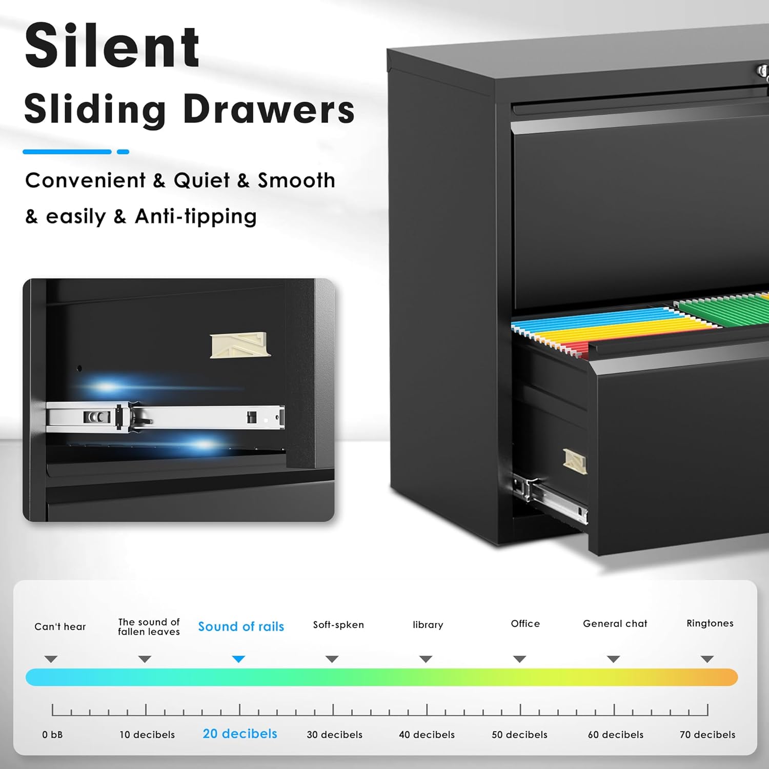 - ♚【Smooth & Silent Rails】Pataku 2 drawer black filing cabinets have smooth rolling bearing drawers, which make the sound of pulling the drawers less than 20 dB to maintain a quiet office atmosphere. The hanging rod in the drawer can effectively sort all kinds of files and keep them clean and tidy.