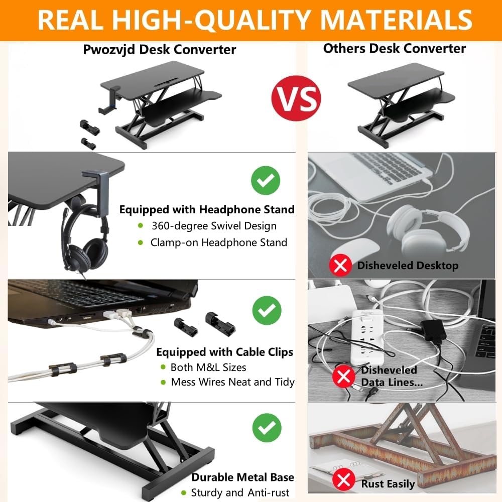 - Equipped with Cable Clips:The standing desk converter is equipped with a pack of cable clips.Just stick the adhesive pads at the back of the cable clips to use.Self-adhesive cable clips are very convenient.Pwozvjd offer clips in M and L sizes.They are suitable for wire management of network cables, headphone cables, USB cables, keyboard cables, telephone cables, audio cables, various power cables.Clean the installation surface,stick them and press firmly for 30 seconds, use them after 24 hours for maximum adhesion.A great helper for desk riser workstation organization.