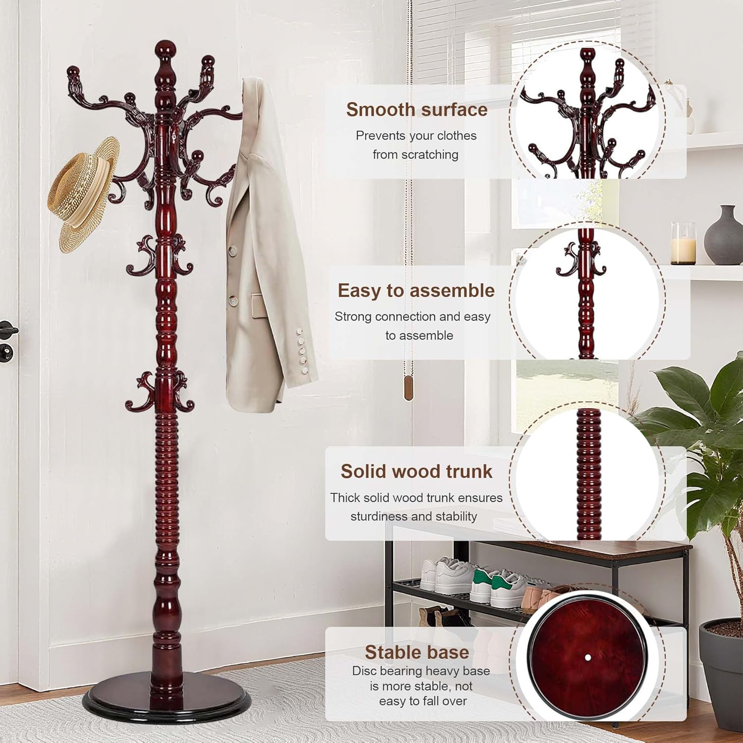 - VINTAGE COAT RACK with 18 HOOKS: The coat tree freestanding has 18 exquisite resin classic hooks, smooth burr-free edges, protects clothing from damage. The hooks evenly distributed to hold coats, bags, hats, ties and accessories without tangling. Make use of vertical space in your homes, is perfect choice to tidy up yourmessy room