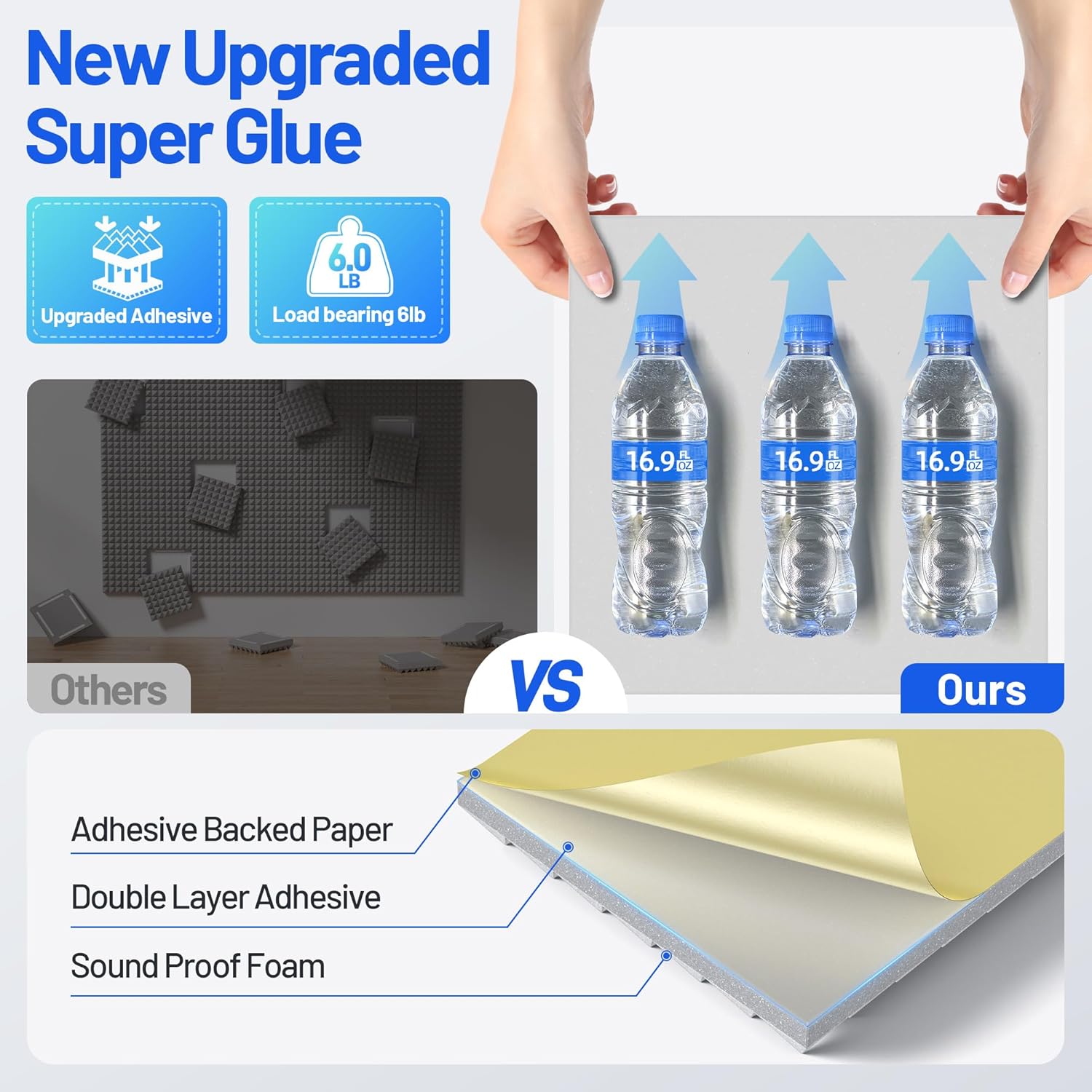 - 💪Super Strong Adhesive: Say goodbye to the trouble of the panel falling off! The adhesive layer of the sound proof foam panels for walls uses a newly upgraded strong double sided adhesive, which greatly improves the adhesion.No tools or additional adhesives are required, just peel off the kraft paper backing and you can easily stick sound dampening panels to the wall, door, window or ceiling.