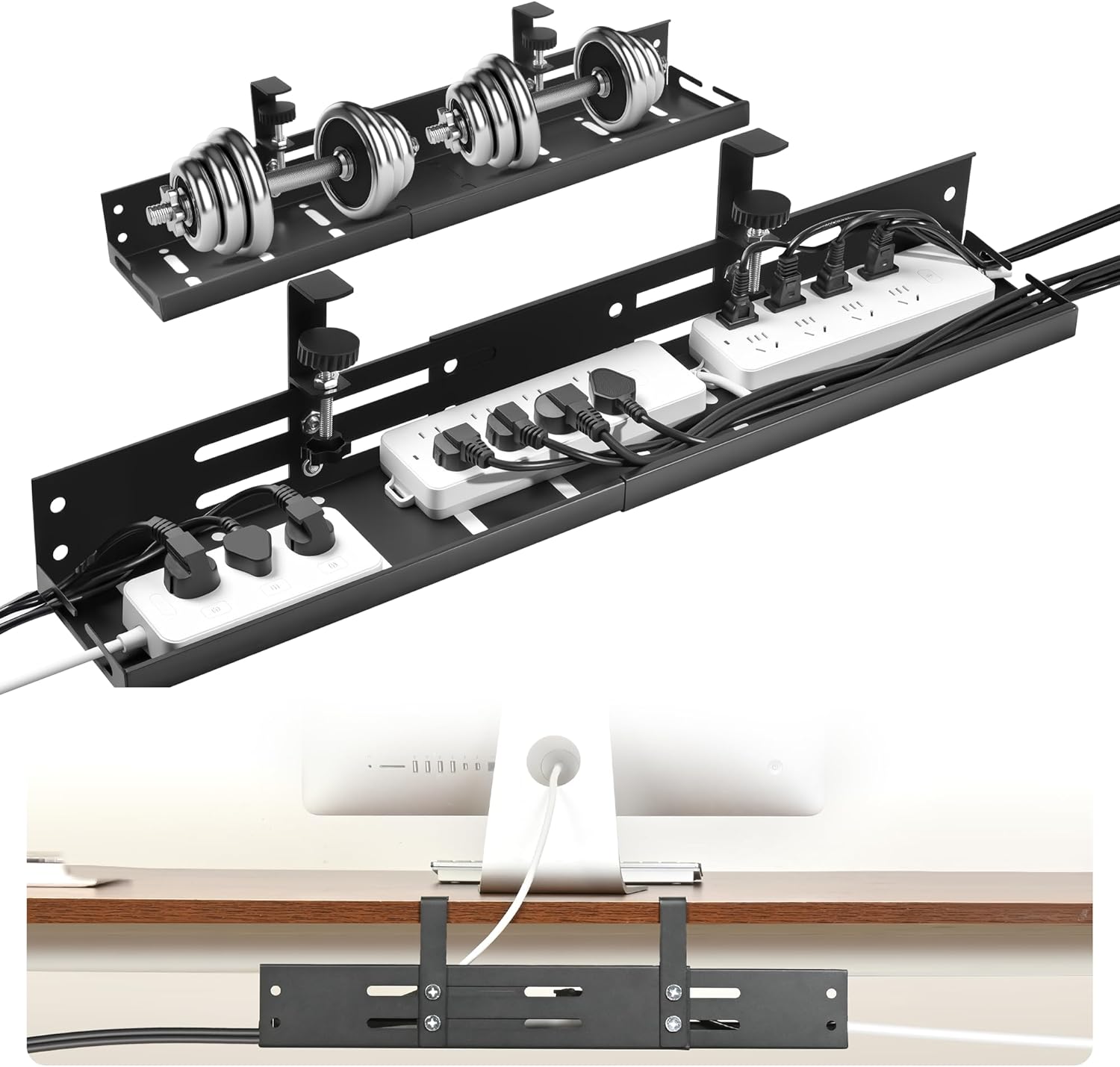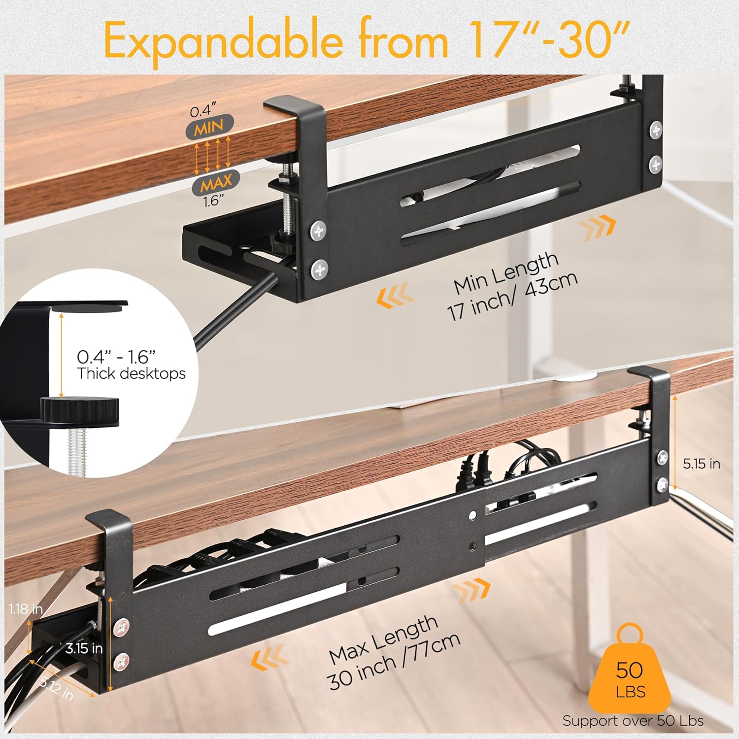 - 【Safe & Tidy】The unique expandable design hides exposed cables and keeps cords neatly organized under the desk, reducing tripping hazards and improving workspace safety. Multiple bottom slots support cable ties to secure wires in place, while the open structure enhances airflow and helps prevent overheating and potential fire risks.