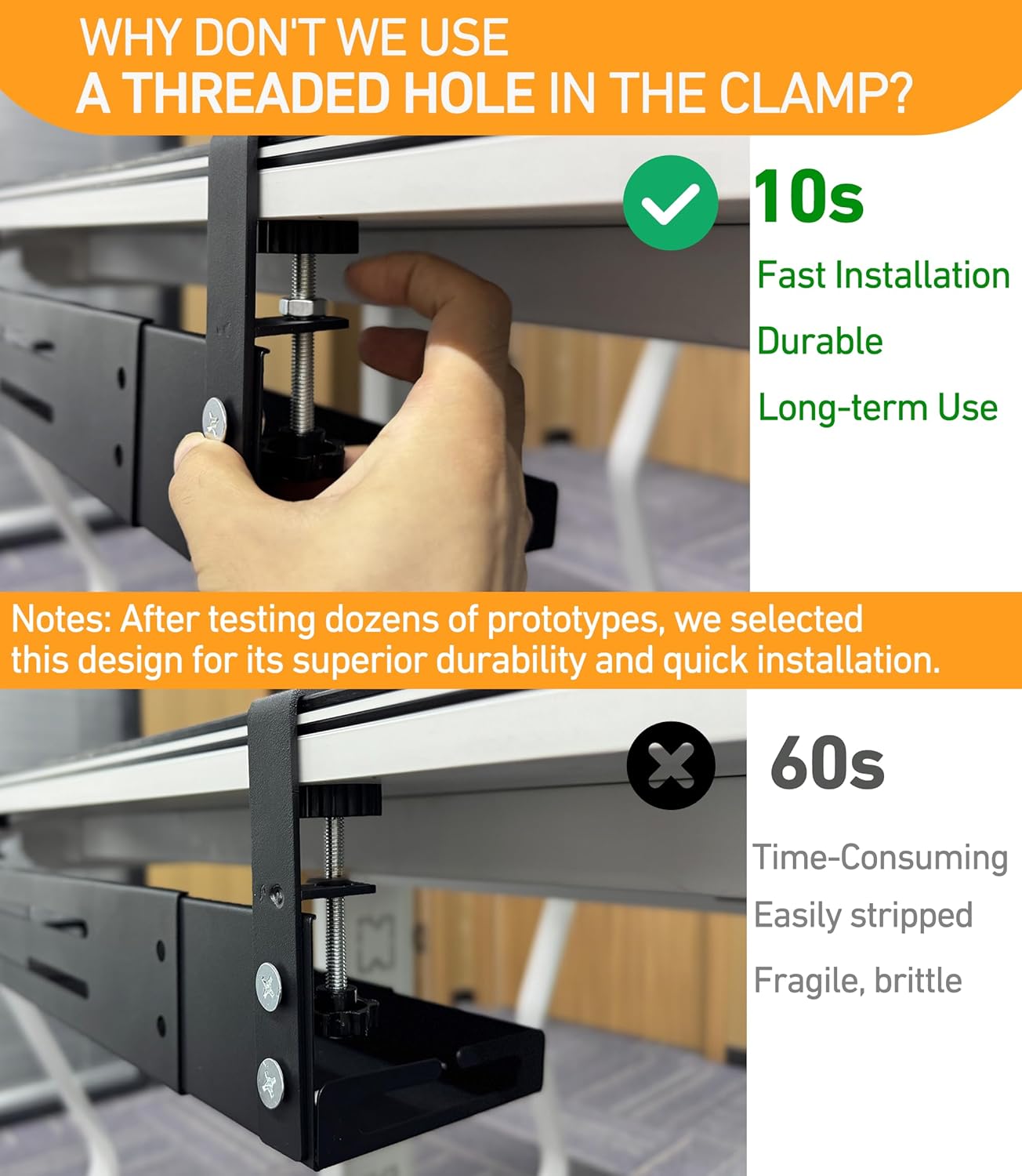 - 【No Drill & Desk-Friendly Installation】This cable management tray clamps directly onto your desk—no drilling required. Equipped with anti-slip pads, it stays securely in place while protecting your desktop from scratches or damage. Includes two mounting directions (inward or outward) to suit different desk layouts and personal needs.