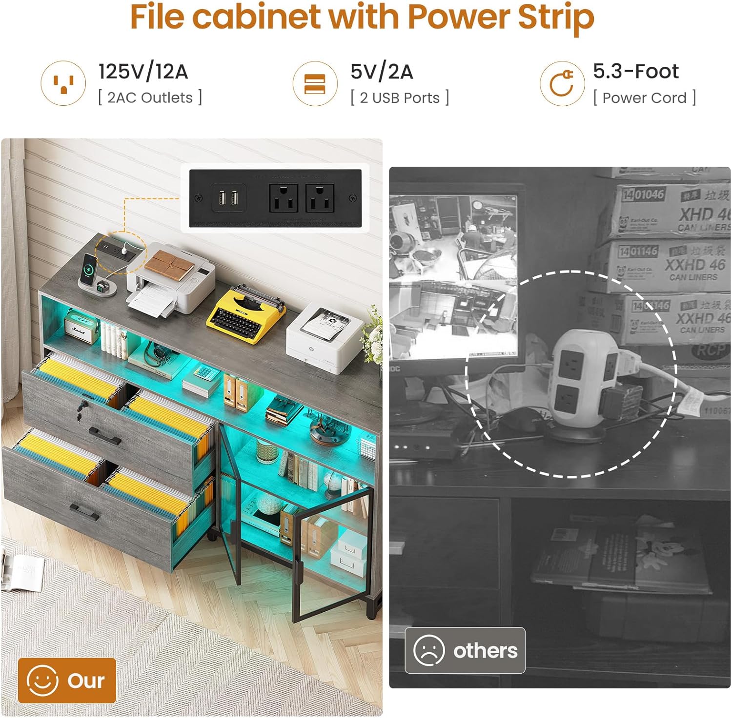 - 📁【What Can You Get?】 The file cabinet has 2 file drawers with 1 lock for Legal, Letter, A4 sizes standard file, power strip for charging 4 devices at the same time, spacious desktop(59"L) large enough for printers and scanners, 4 storage shelves, a pair of acrylic cabinet door for protecte documents and LED light. Filing cabinet that can be combined with any computer desk to form an L-shaped office area.