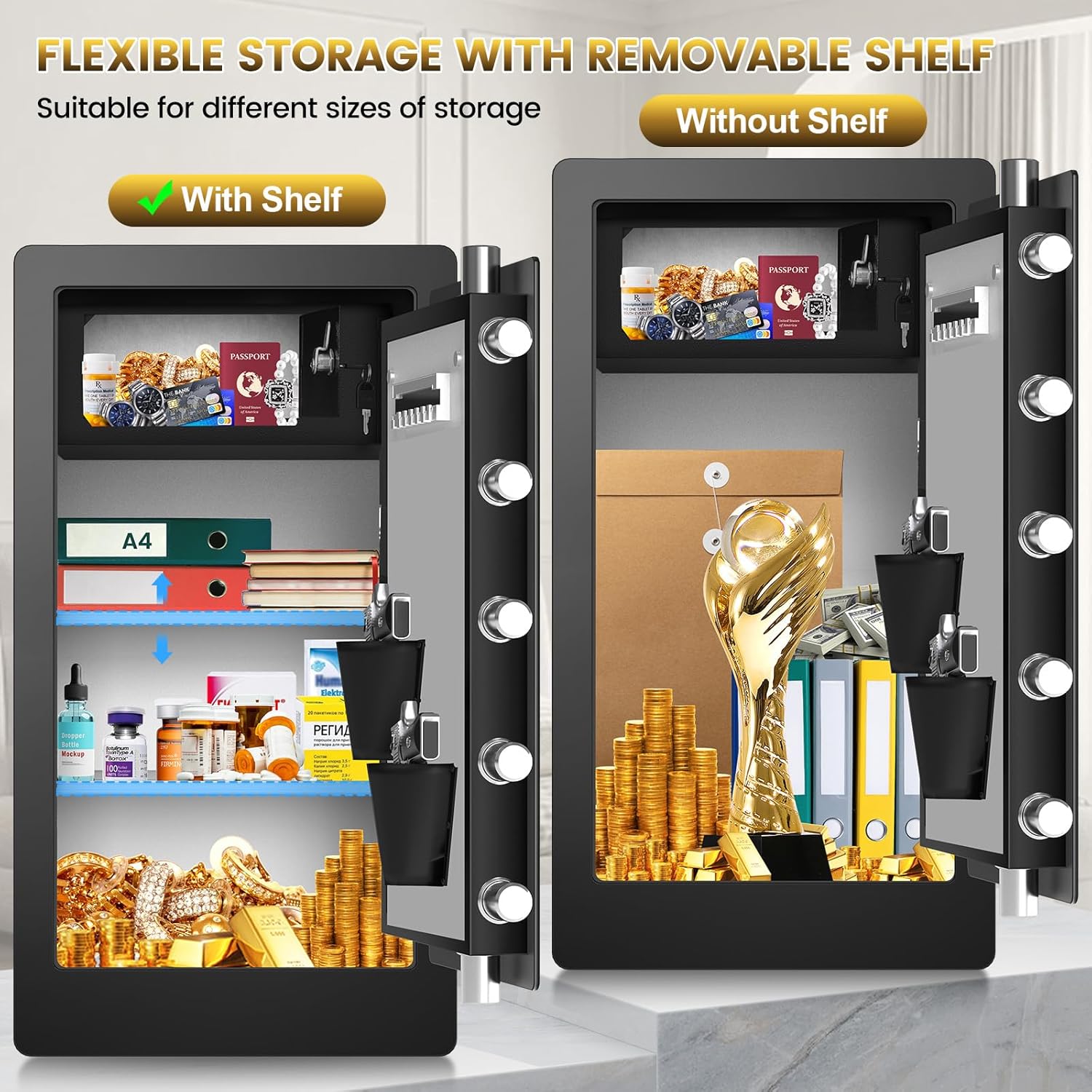 - 【Giant Capacity Home Safe】This black box hides smart storage! Locked top compartment for jewelry, secret bottom stash for valuables, removable shelves adjust space. Side hooks for keys + document pockets. Even stores rifles upright!